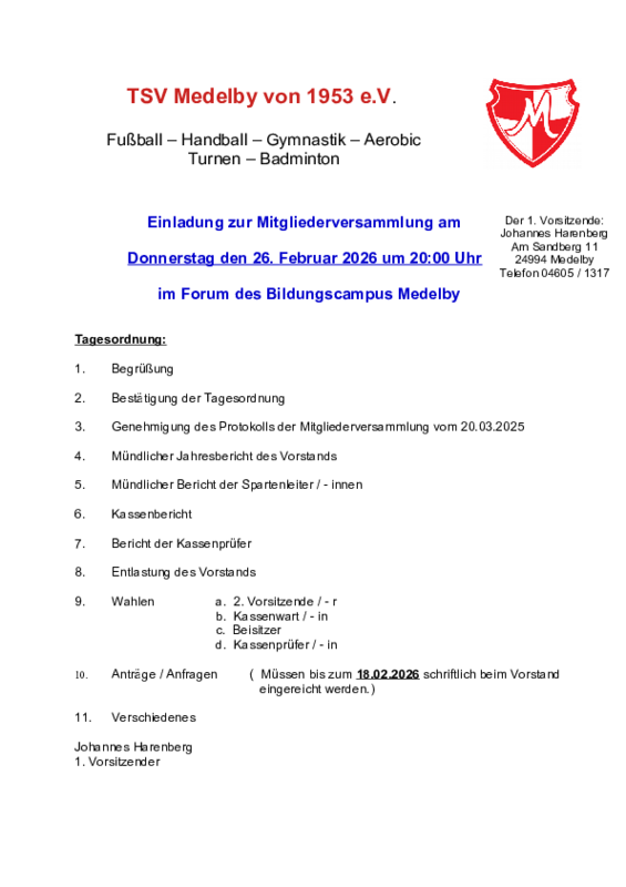 - Anträge / Anfragen (Müssen bis zum 18.02.2026 schriftlich beim Vorstand eingereicht werden.)